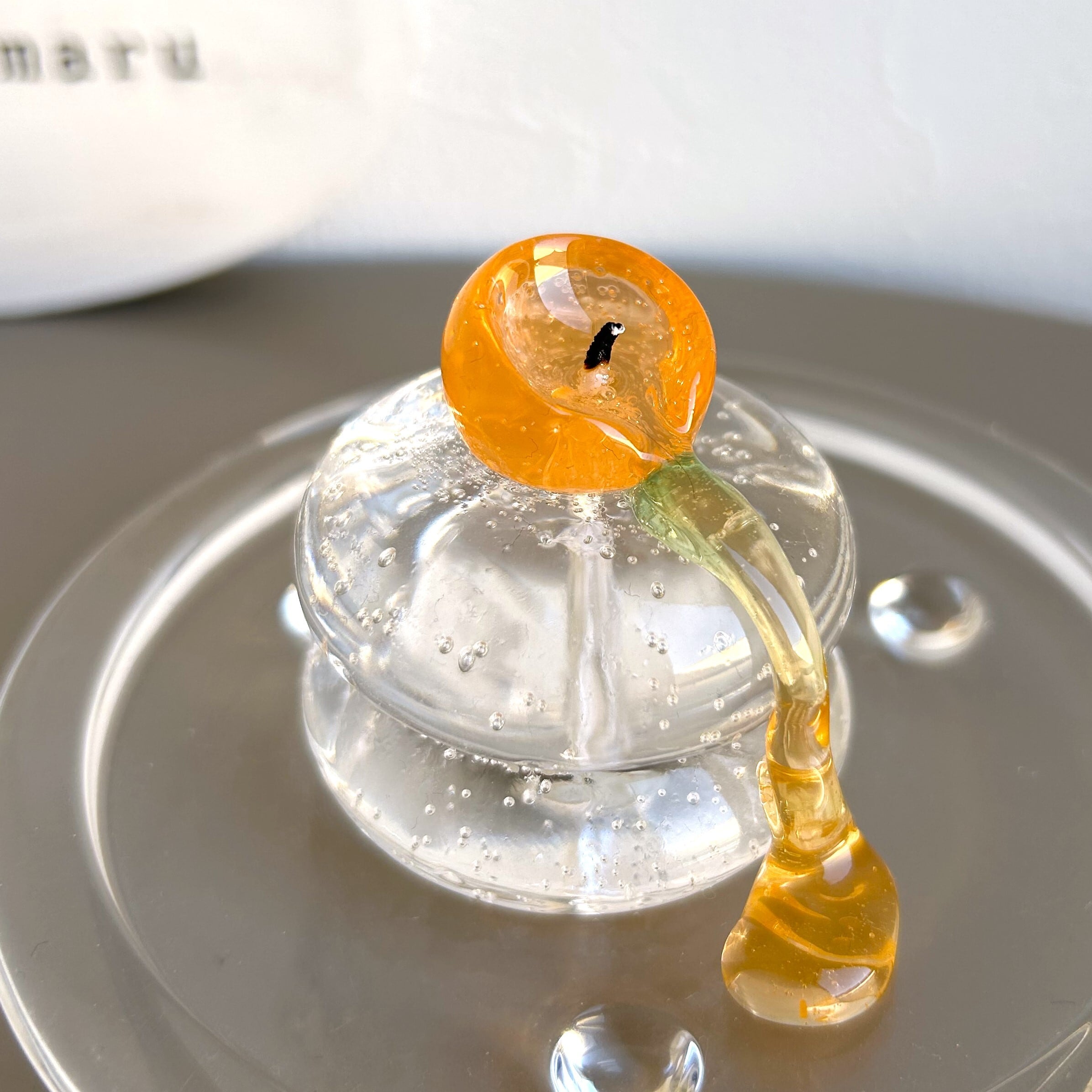 きらきら光る透明の御鏡の上にちょこんとお座りしている橙。